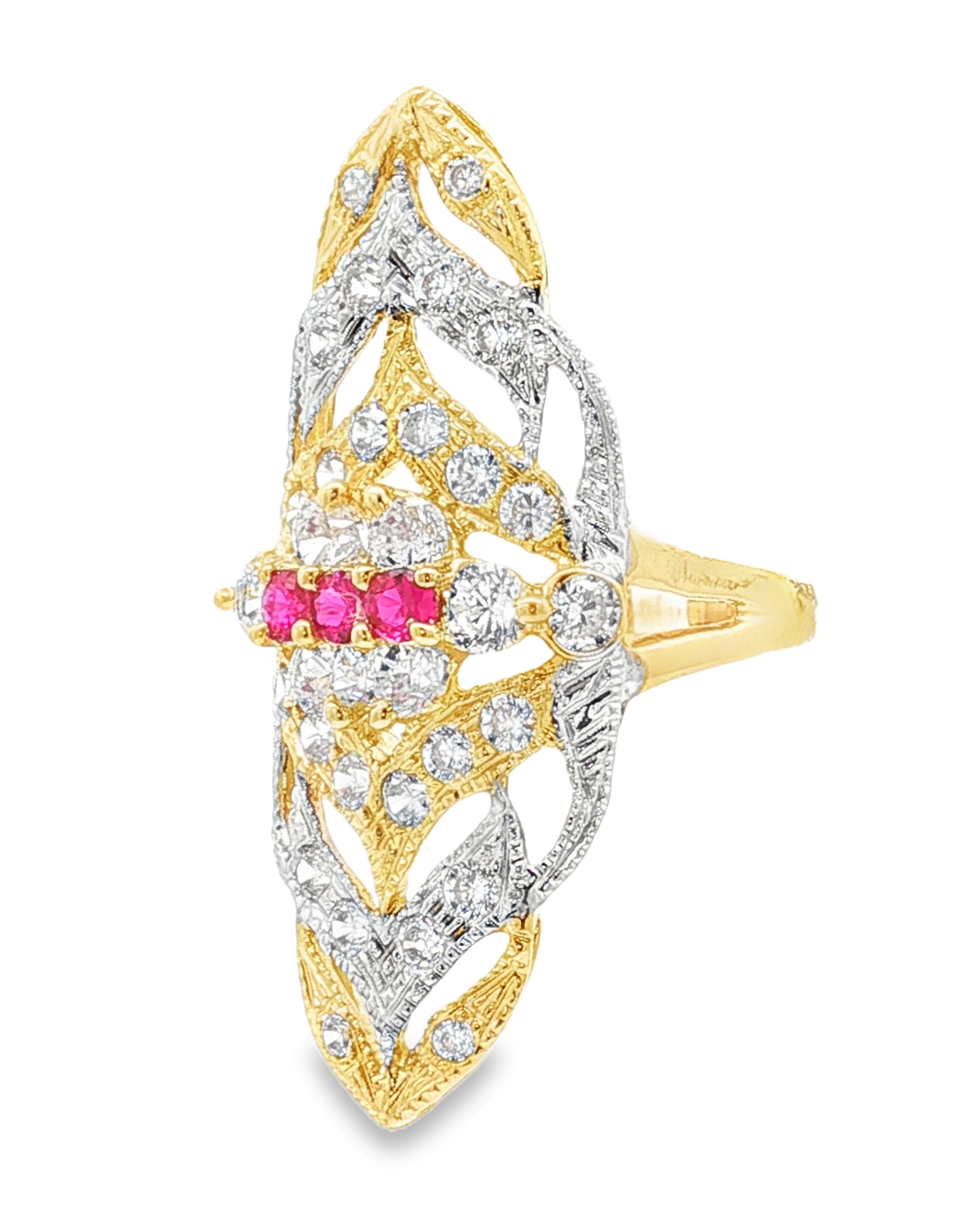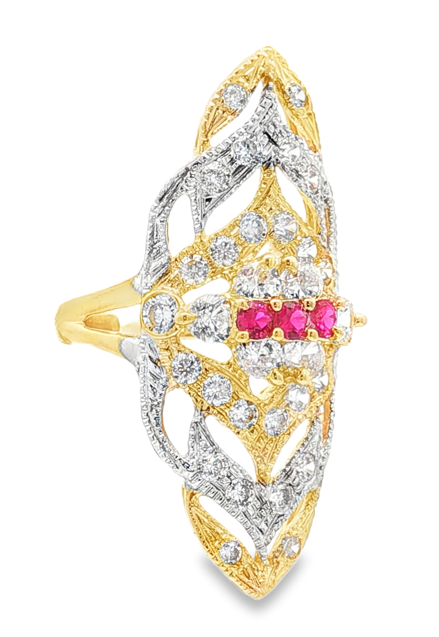 Alliance de l'or jaune et blanc pour cette très belle bague marquise en or 18 carats. Bague à la forme ovale pour cette marquise tout en longueur et aux dimensions extra-large. Au centre de la bague un oxyde de zirconium de taille marquise orne cette réalisation. Le plateau au mélange des 2 ors est aussi sertie par plusieurs oxyde de zirconium. La bague a pour dimensions 18 x 41 mm. Le poids d'or moyen pour un tour de bague 56 est de 9,5 grammes. Le poids d'or peut varier selon le tour de doigt.