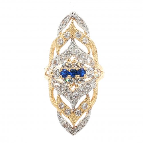 Alliance de l'or jaune et blanc pour cette très belle bague marquise en or 18 carats. Bague à la forme ovale pour cette marquise tout en longueur et aux dimensions extra-large. Au centre de la bague un oxyde de zirconium de taille marquise orne cette réalisation. Le plateau au mélange des 2 ors est aussi sertie par plusieurs oxyde de zirconium. La bague a pour dimensions 18 x 41 mm. Le poids d'or moyen pour un tour de bague 56 est de 9,5 grammes. Le poids d'or peut varier selon le tour de doigt.
