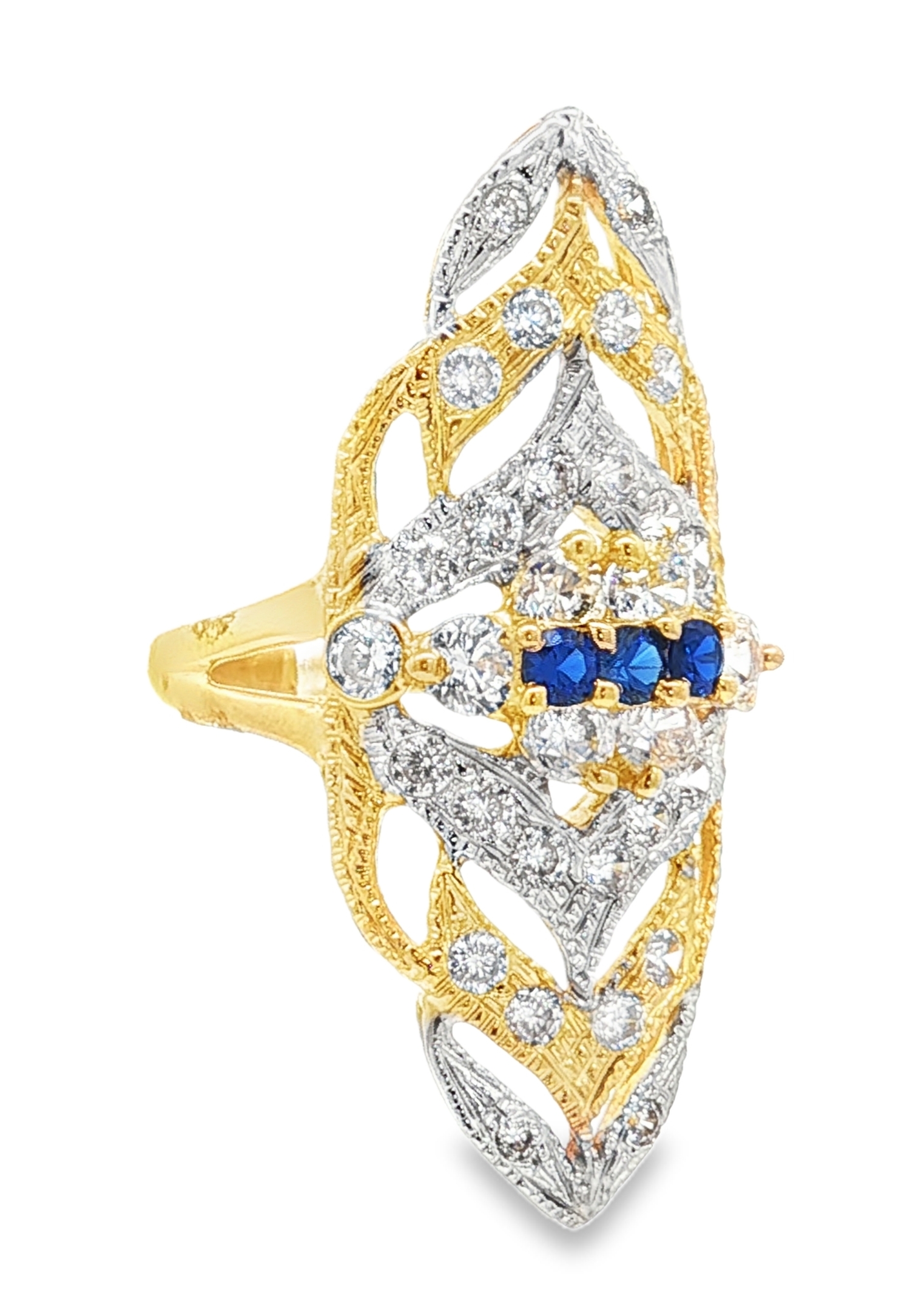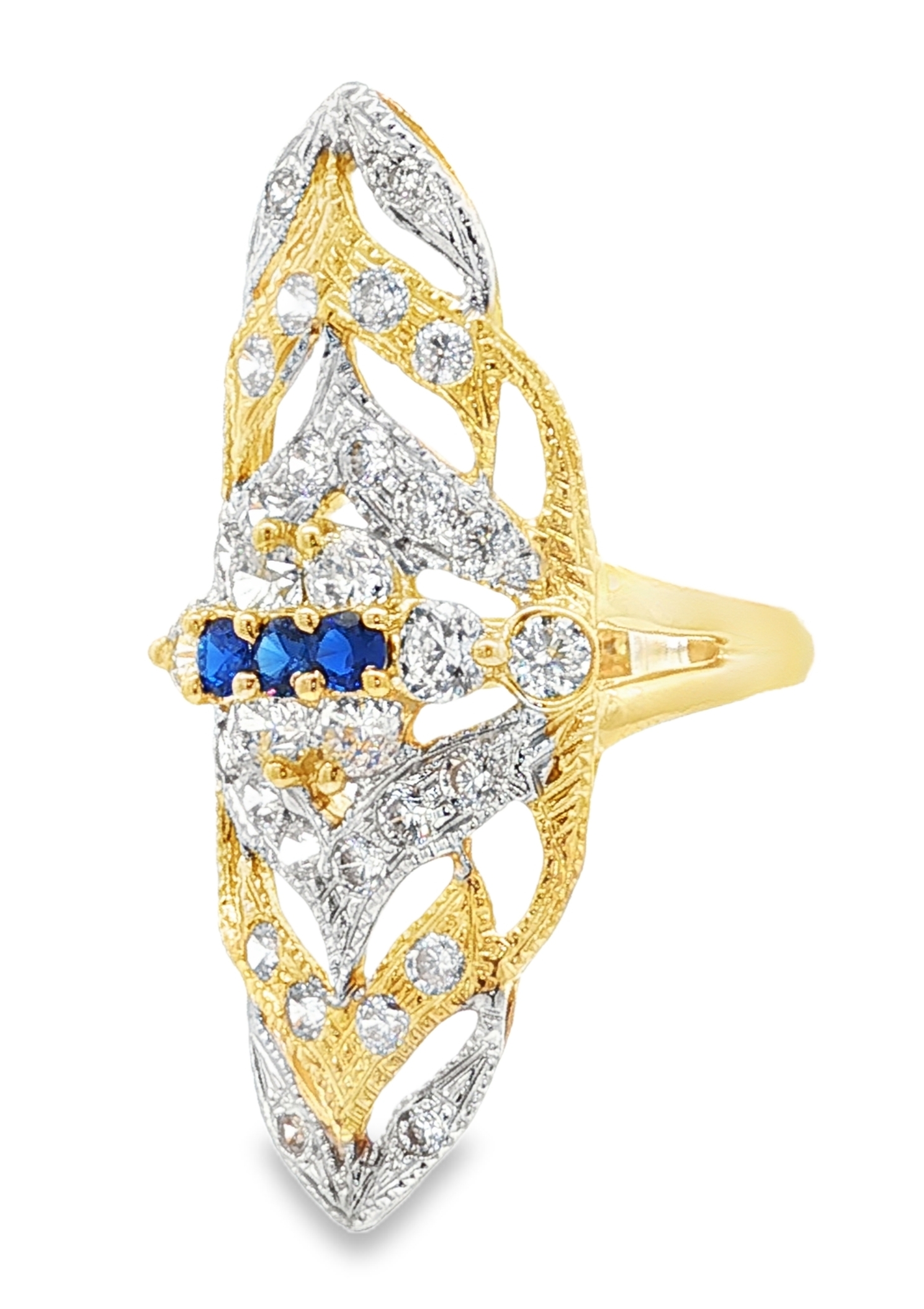 Alliance de l'or jaune et blanc pour cette très belle bague marquise en or 18 carats. Bague à la forme ovale pour cette marquise tout en longueur et aux dimensions extra-large. Au centre de la bague un oxyde de zirconium de taille marquise orne cette réalisation. Le plateau au mélange des 2 ors est aussi sertie par plusieurs oxyde de zirconium. La bague a pour dimensions 18 x 41 mm.  Le poids d'or moyen pour un tour de bague 56 est de 9,5 grammes. Le poids d'or peut varier selon le tour de doigt.