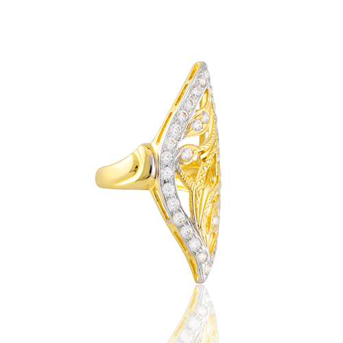 Travail soigné et élégant pour cette belle bague marquise revisité. Bague marquise en or jaune 750/1000, qui reprend le dessin d'une jolie feuille sertie d'oxyde de zirconium. Cette bague est de forme ovale, tout en longueur avec des extrémités en pointe. Le plateau de forme losange à pour dimensions 17 x 39 mm. Le poids d'or moyen pour un tour de bague 56 est de 9,5 grammes. Le poids d'or peut varier selon le tour de doigt.