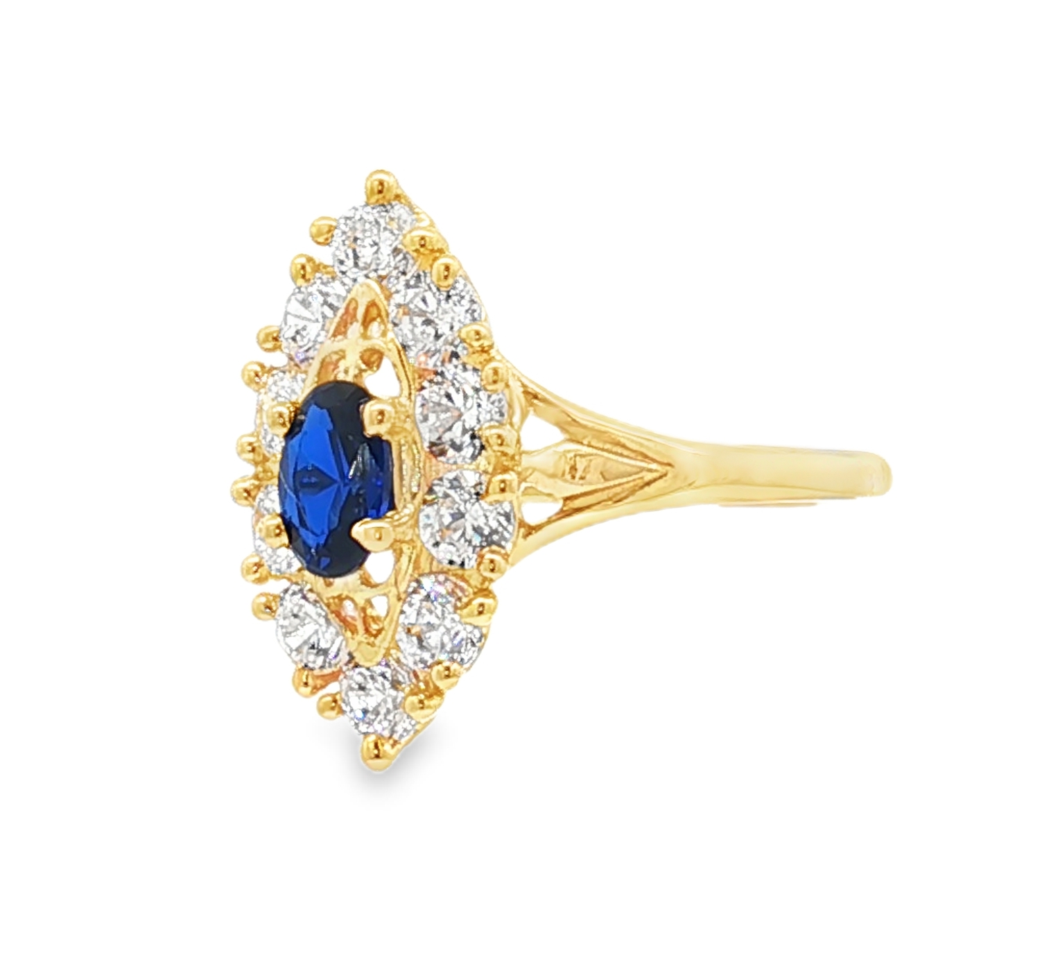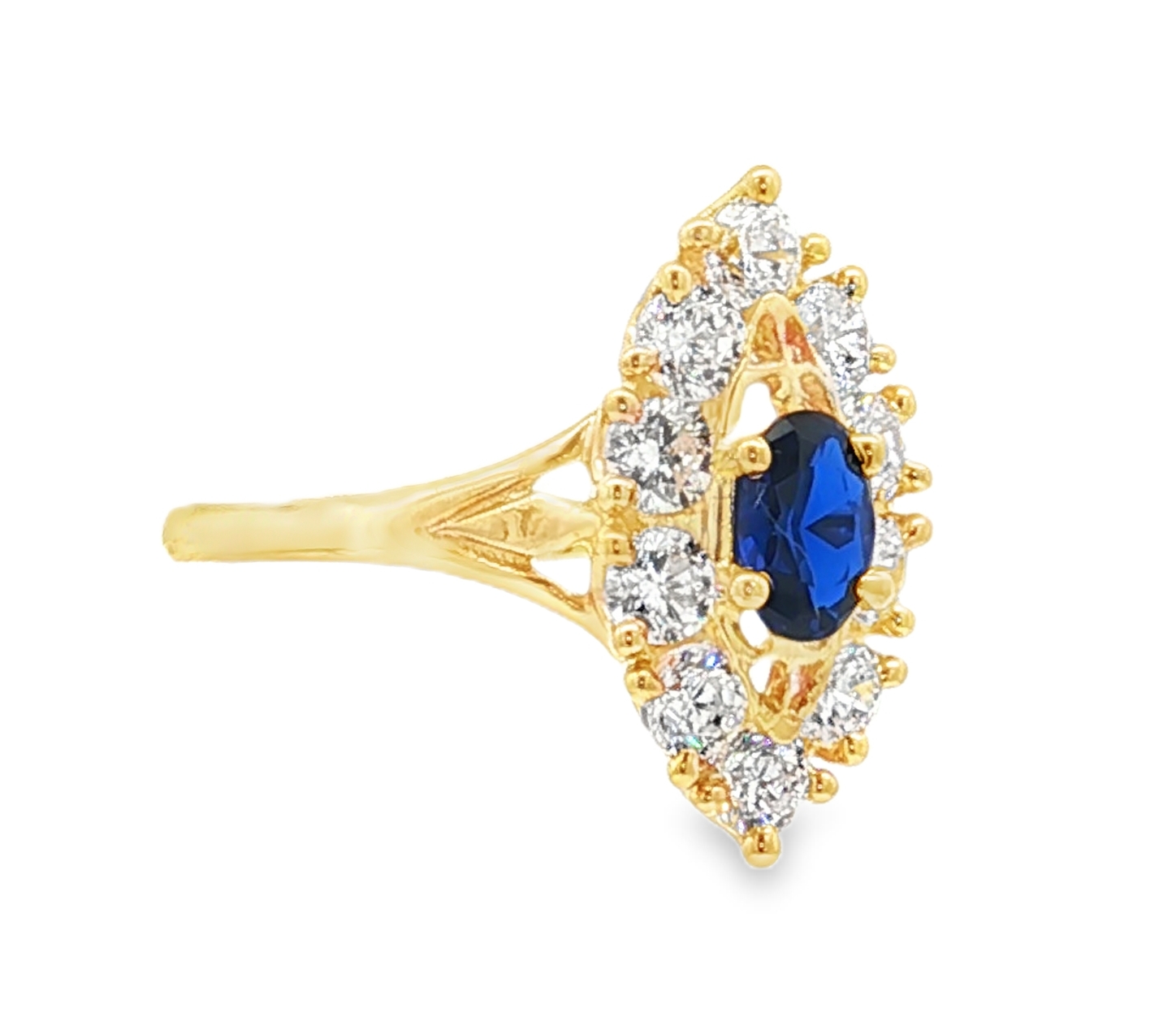 Élégante bague multi-pierres en or jaune, ornée d'un magnifique oxyde de zirconium de couleur bleu de forme ovale taillé en cabochon. La monture en or met en valeur la couleur bleu profond de l'oxyde, captivant le regard avec sa transparence et son éclat. Cette bague est une pièce de joaillerie raffinée, parfaite pour ajouter une touche de couleur et de luxe à votre collection. Le plateau de forme losange à pour dimensions 10 x 18 mm. Le poids d'or moyen pour un tour de bague 56 est de 3,7 grammes. Le poids d'or peut varier selon le tour de doigt.