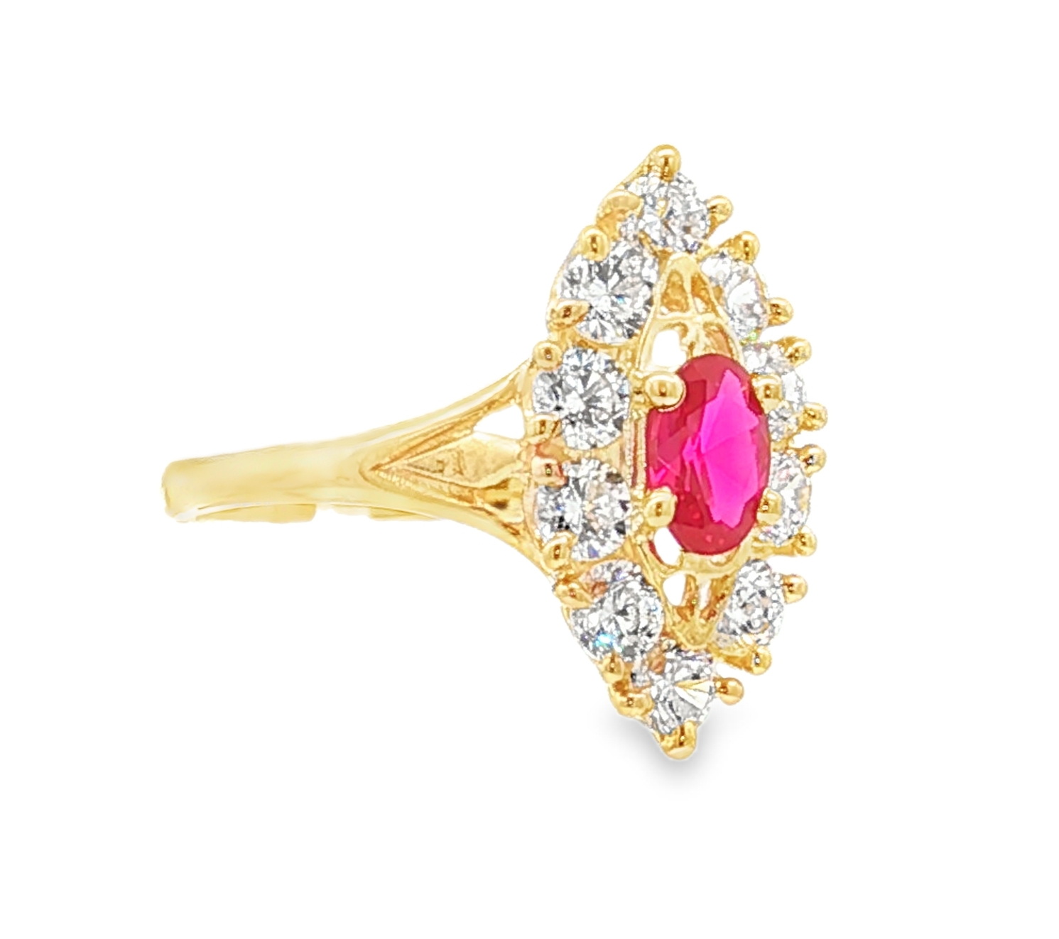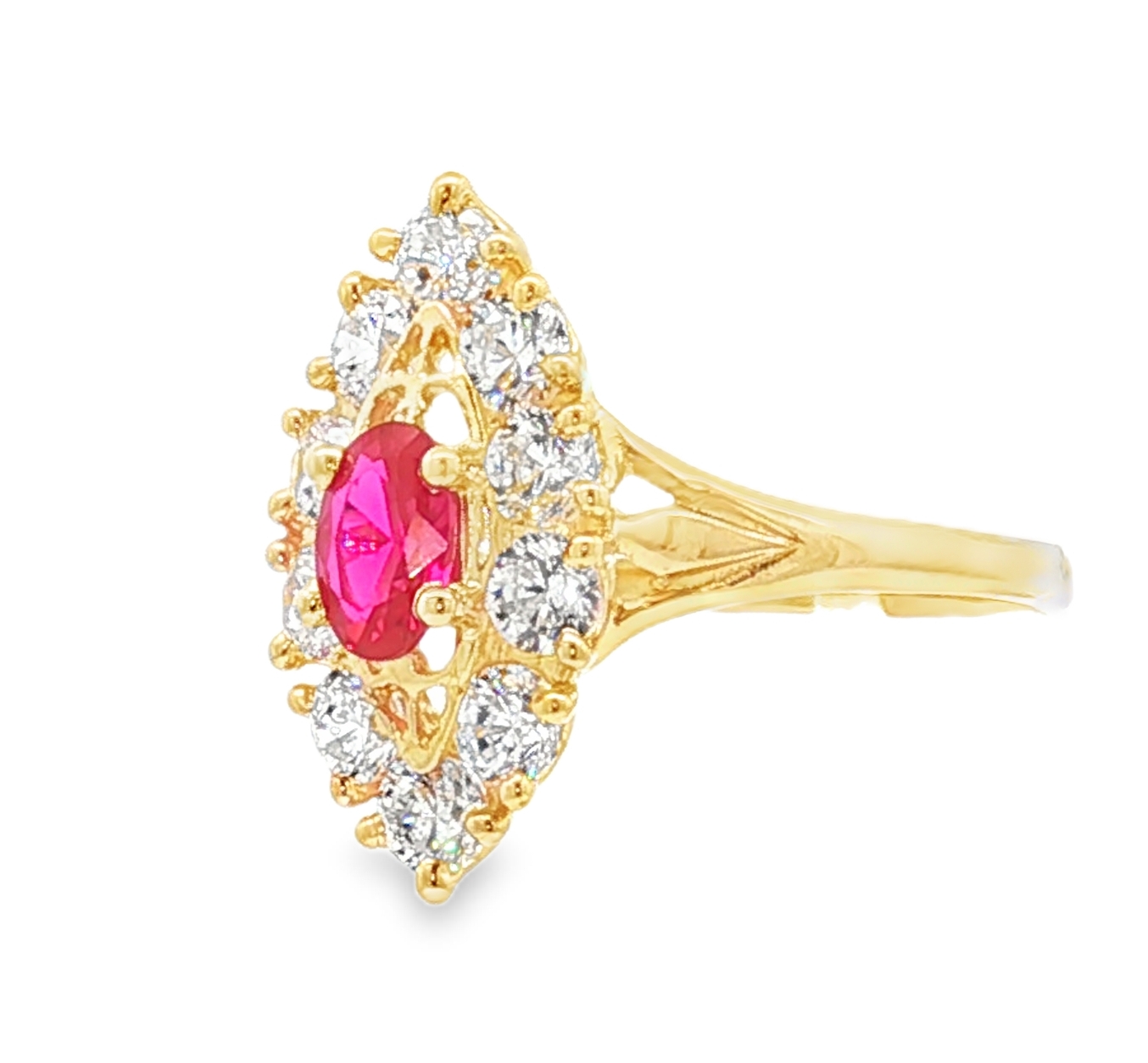 Élégante bague multi-pierres en or jaune, ornée d'un magnifique oxyde de zirconium de couleur rouge de forme ovale taillé en cabochon. La monture en or met en valeur la couleur rouge profond de l'oxyde, captivant le regard avec sa transparence et son éclat. Cette bague est une pièce de joaillerie raffinée, parfaite pour ajouter une touche de couleur et de luxe à votre collection. Le plateau de forme losange à pour dimensions 10 x 18 mm. Le poids d'or moyen pour un tour de bague 56 est de 3,7 grammes. Le poids d'or peut varier selon le tour de doigt.