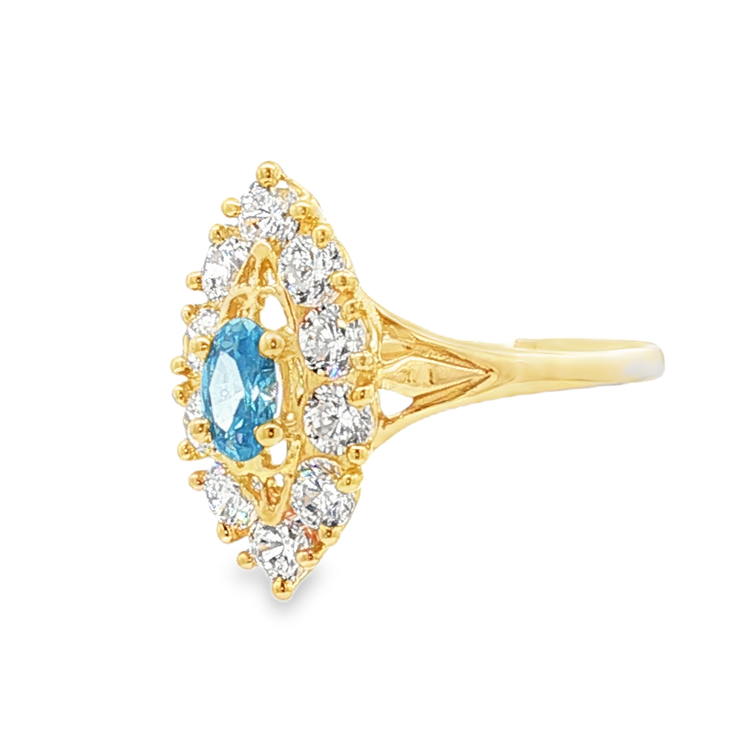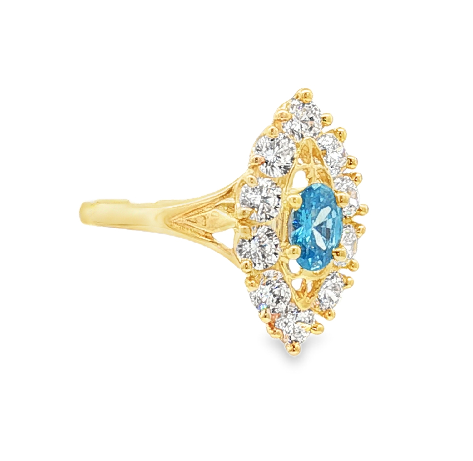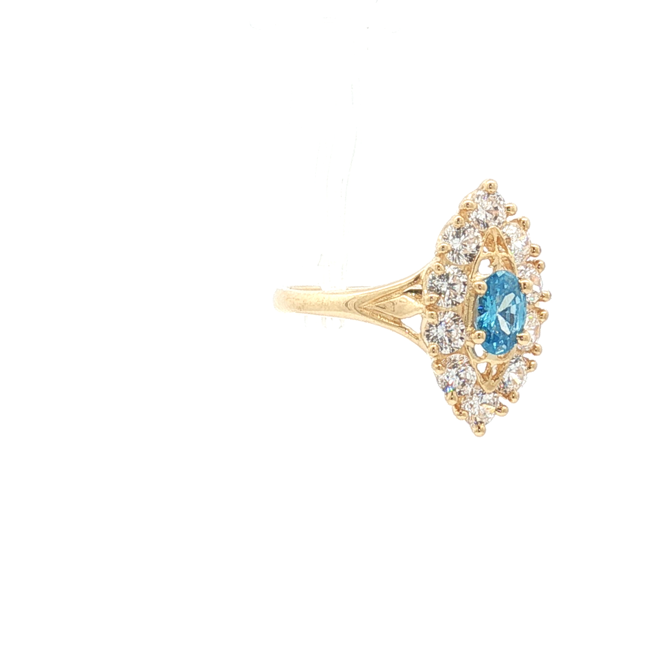 Élégante bague multi-pierres en or jaune, ornée d'un magnifique oxyde de zirconium de couleur turquoise de forme ovale taillé en cabochon. La monture en or met en valeur la couleur turquoise profond de l'oxyde, captivant le regard avec sa transparence et son éclat. Cette bague est une pièce de joaillerie raffinée, parfaite pour ajouter une touche de couleur et de luxe à votre collection. Le plateau de forme losange à pour dimensions 10 x 18 mm. Le poids d'or moyen pour un tour de bague 56 est de 3,7 grammes. Le poids d'or peut varier selon le tour de doigt.