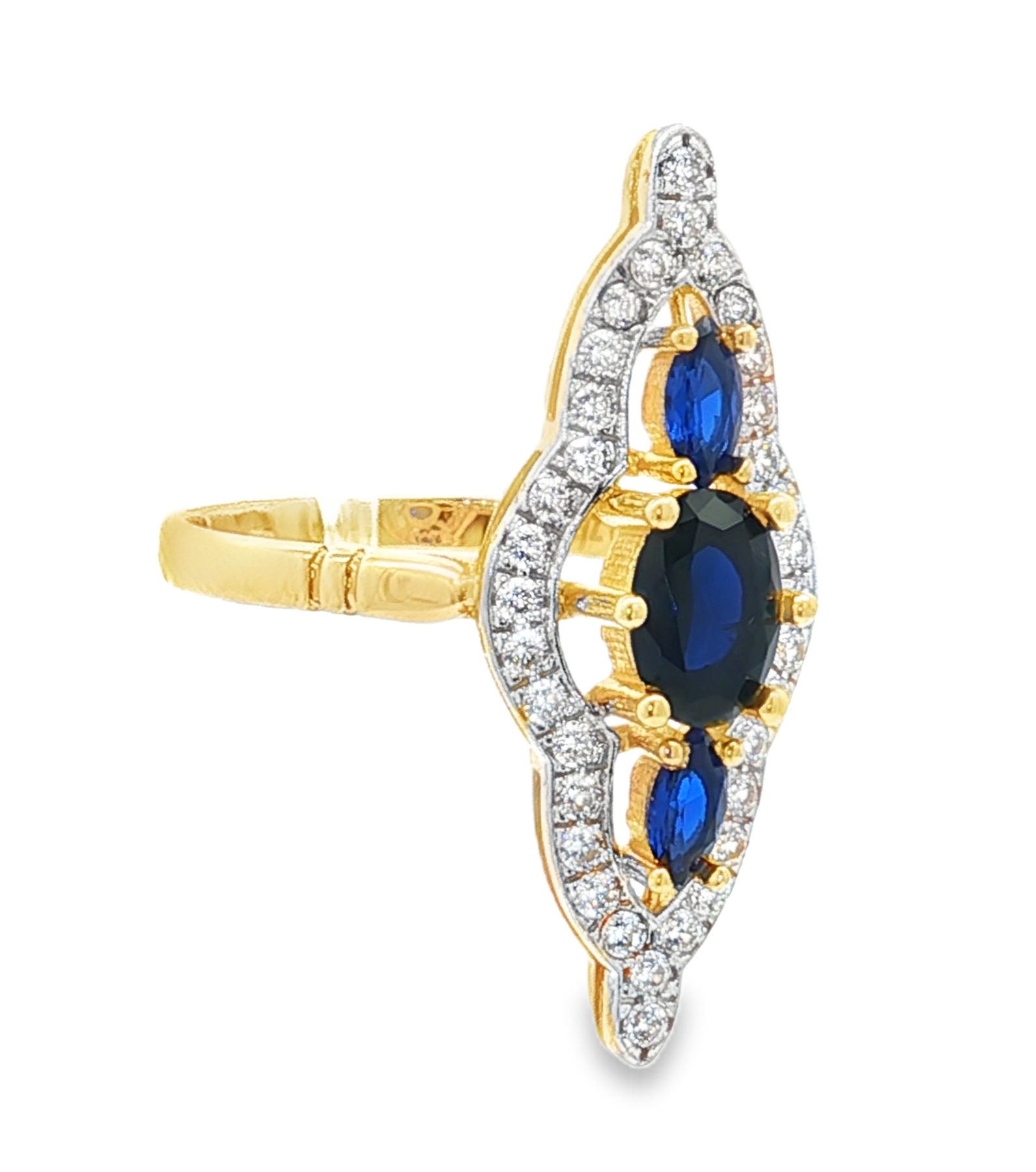 Elégance et raffinement pour cette bague marquise en or à l'allure royale. Bague marquise en or jaune 18 carats à la forme d'une navette, tout en longueur avec des extrémités en pointe ornée de 3 oxydes de zirconium de couleur bleu, montée sur un corps épais et robuste. Le plateau de forme losange à pour dimensions 11 x 29 mm. Le poids d'or moyen pour un tour de bague 56 est de 4 grammes. Le poids d'or peut varier selon le tour de doigt.