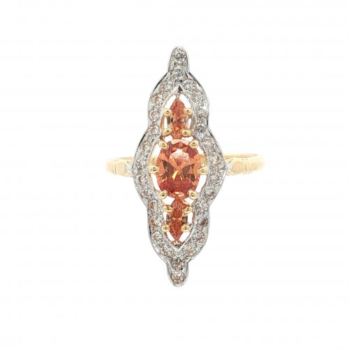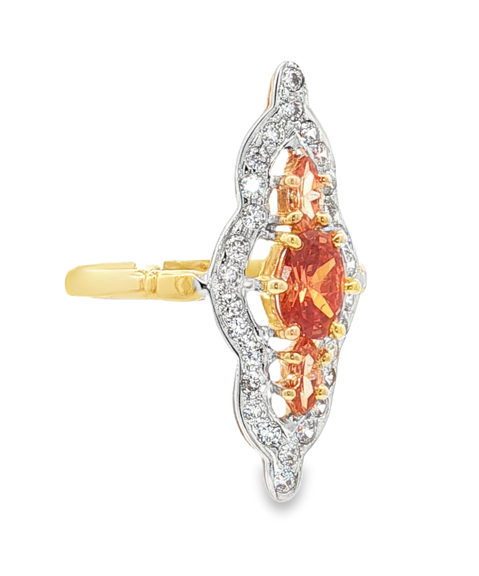 Elégance et raffinement pour cette bague marquise en or à l'allure royale. Bague marquise en or jaune 18 carats à la forme d'une navette, tout en longueur avec des extrémités en pointe ornée de 3 oxydes de zirconium de couleur orange, montée sur un corps épais et robuste. Le plateau de forme losange à pour dimensions 11 x 29 mm. Le poids d'or moyen pour un tour de bague 56 est de 3,9 grammes. Le poids d'or peut varier selon le tour de doigt.