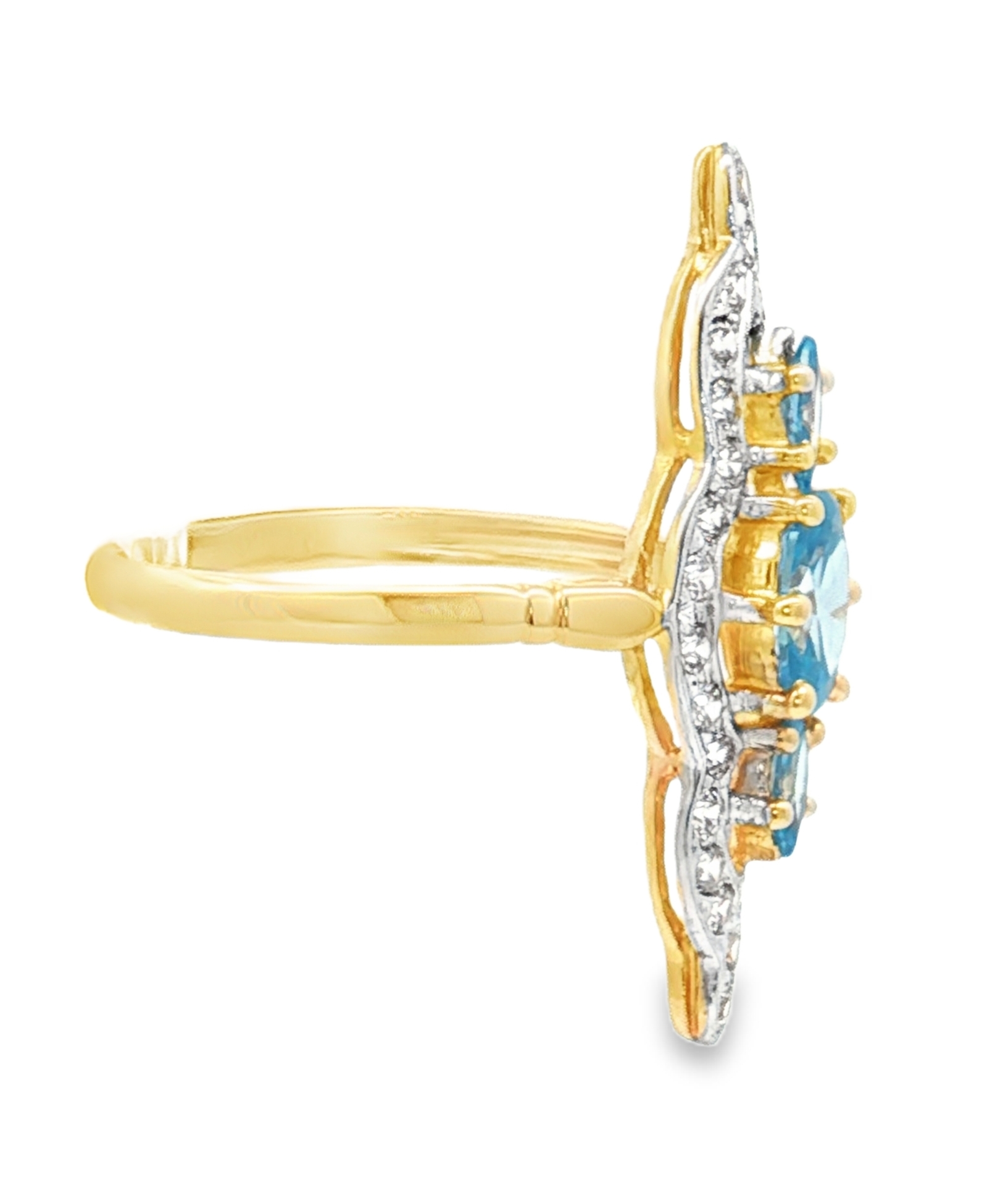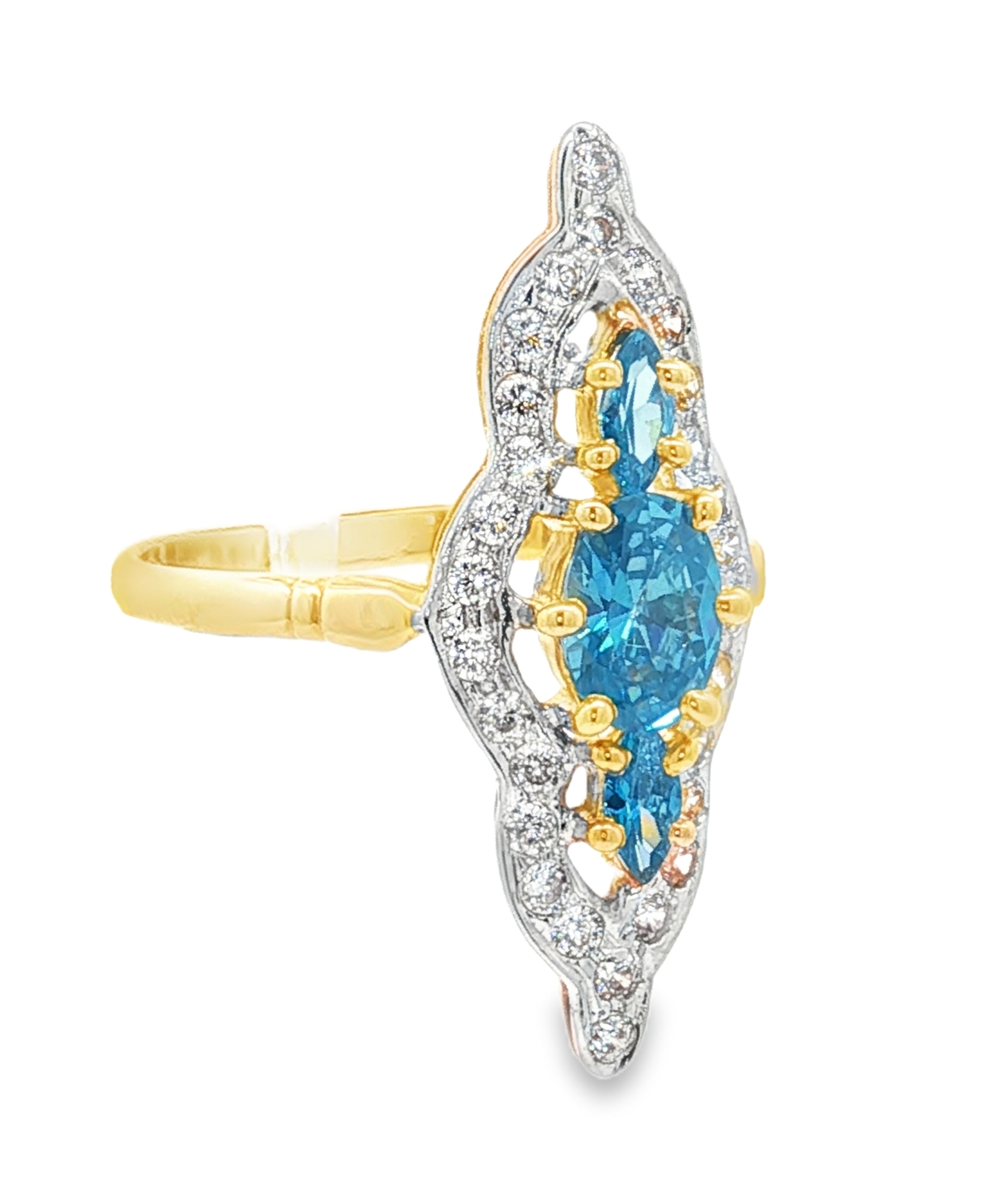 Elégance et raffinement pour cette bague marquise en or à l'allure royale. Bague marquise en or jaune 18 carats à la forme d'une navette, tout en longueur avec des extrémités en pointe ornée de 3 oxydes de zirconium de couleur turquoise, montée sur un corps épais et robuste. Le plateau de forme losange à pour dimensions 11 x 29 mm. Le poids d'or moyen pour un tour de bague 56 est de 4 grammes. Le poids d'or peut varier selon le tour de doigt.