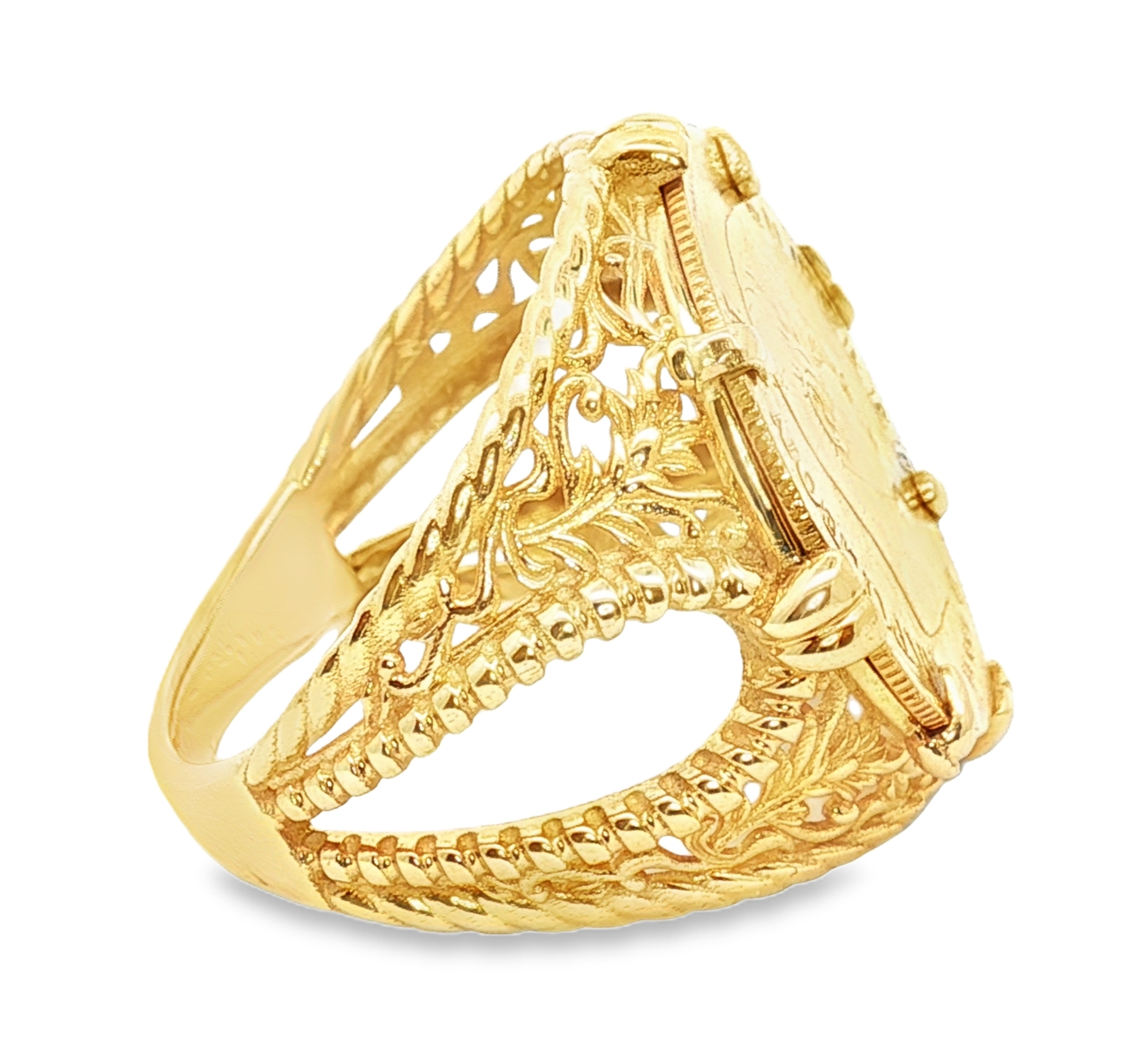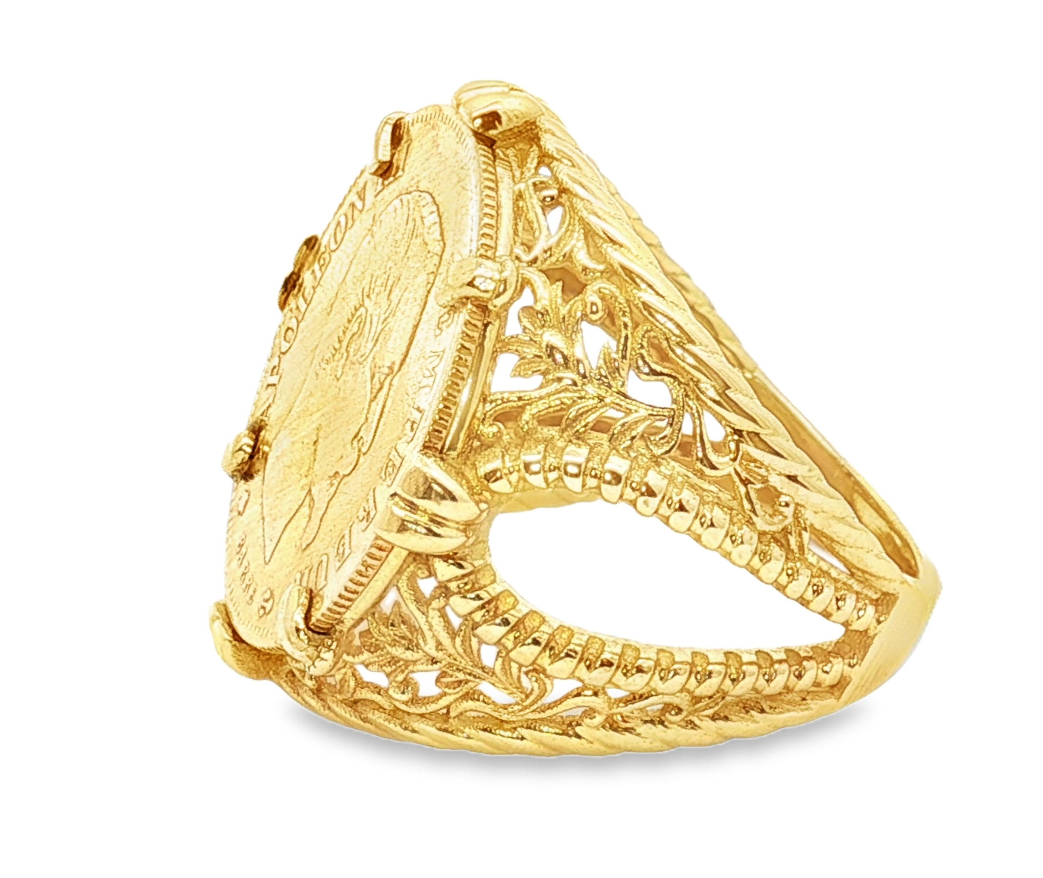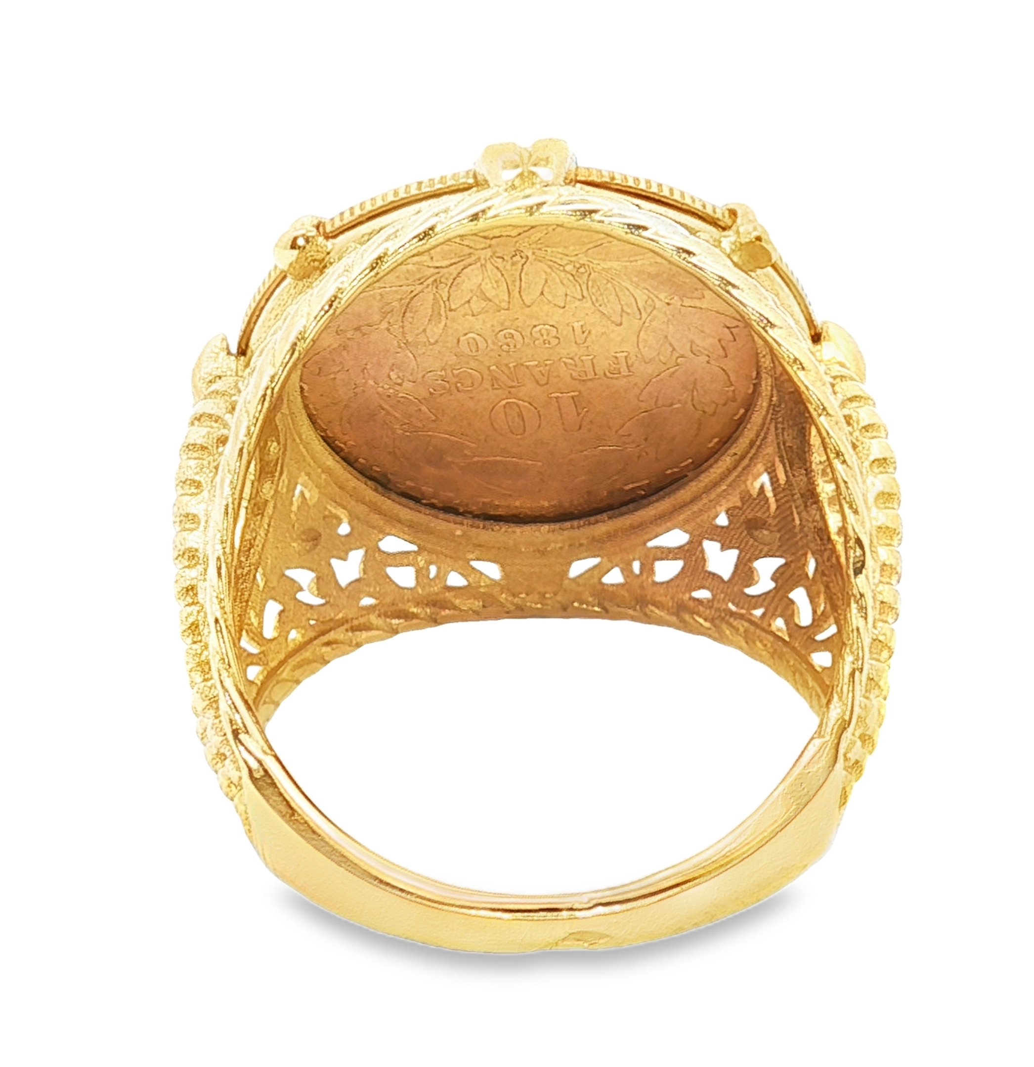 Splendide bague porte pièce en or jaune 18 carats. Modèle originale et moderne, cette bague en or est sertie par le dessus d'une pièce Napoélon de 10 FR en or 900/1000. Le poids d'or moyen pour un tour de bague 56 est de 9,5 grammes. Le poids d'or peut varier selon le tour de doigt.