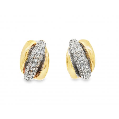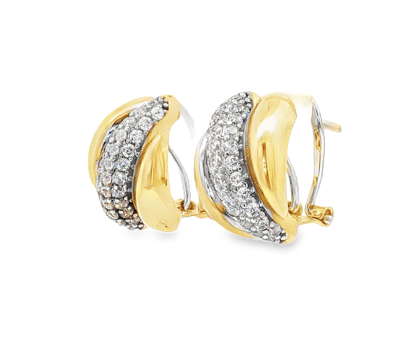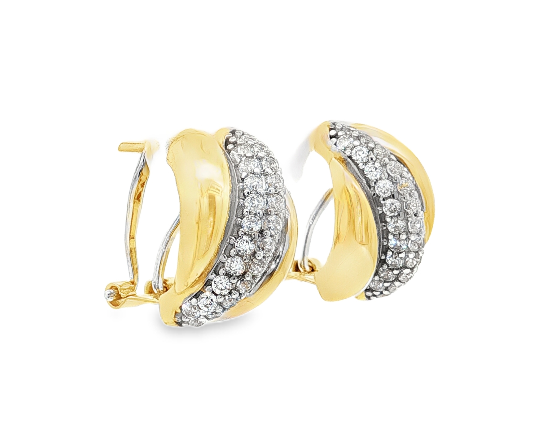 Sublimes boucles d'oreilles créoles en or jaune 18 carats, rehaussées d'oxyde de zirconium. L'éclat des pierres, avec leur taille brillant, illumine l'or jaune, créant un contraste saisissant et une brillance exceptionnelle. Une composition raffinée pour une élégance intemporelle. Le système de fermeture Omega est en or blanc afin de garantir une meilleure robustesse. Le poids théorique de cette boucle d'oreille est de 6 grammes pour une dimension de 15 mm x 11 mm.