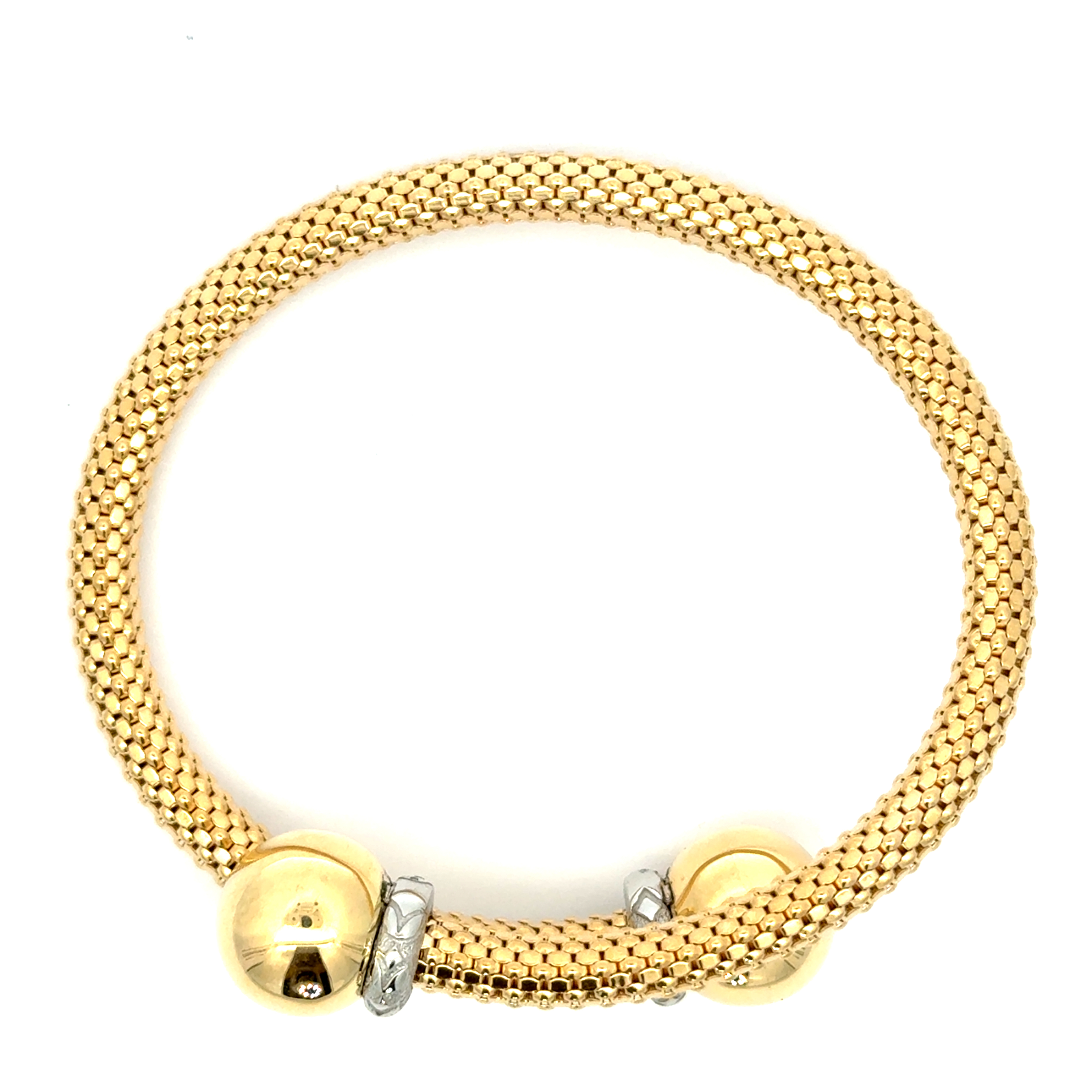 Ce bracelet jonc en or jaune 750/1000 incarne l'élégance discrète. Sa structure délicate, composée de multiples petites sphères dorées, offre un design à la fois classique et moderne. L'éclat chaleureux de l'or illumine le poignet, faisant de ce bijou un accessoire idéal pour rehausser une tenue avec une touche de luxe raffiné. La largeur de la structure est de 5 mm. Il s'agit d'un bracelet de taille standard, soit 6,5 cm de diamètre, pour un poids de 18,1 grammes.