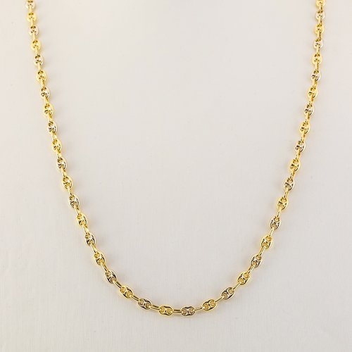 Chaîne maille grain de café en 2 ors, jaune, blanc en or 18 carats. Cette chaîne est proposée avec un fermoir mousqueton. Largeur du grain 5 mm. Le poids d'or théorique pour une chaîne en longueur 60 cm est de 13,5 grammes.