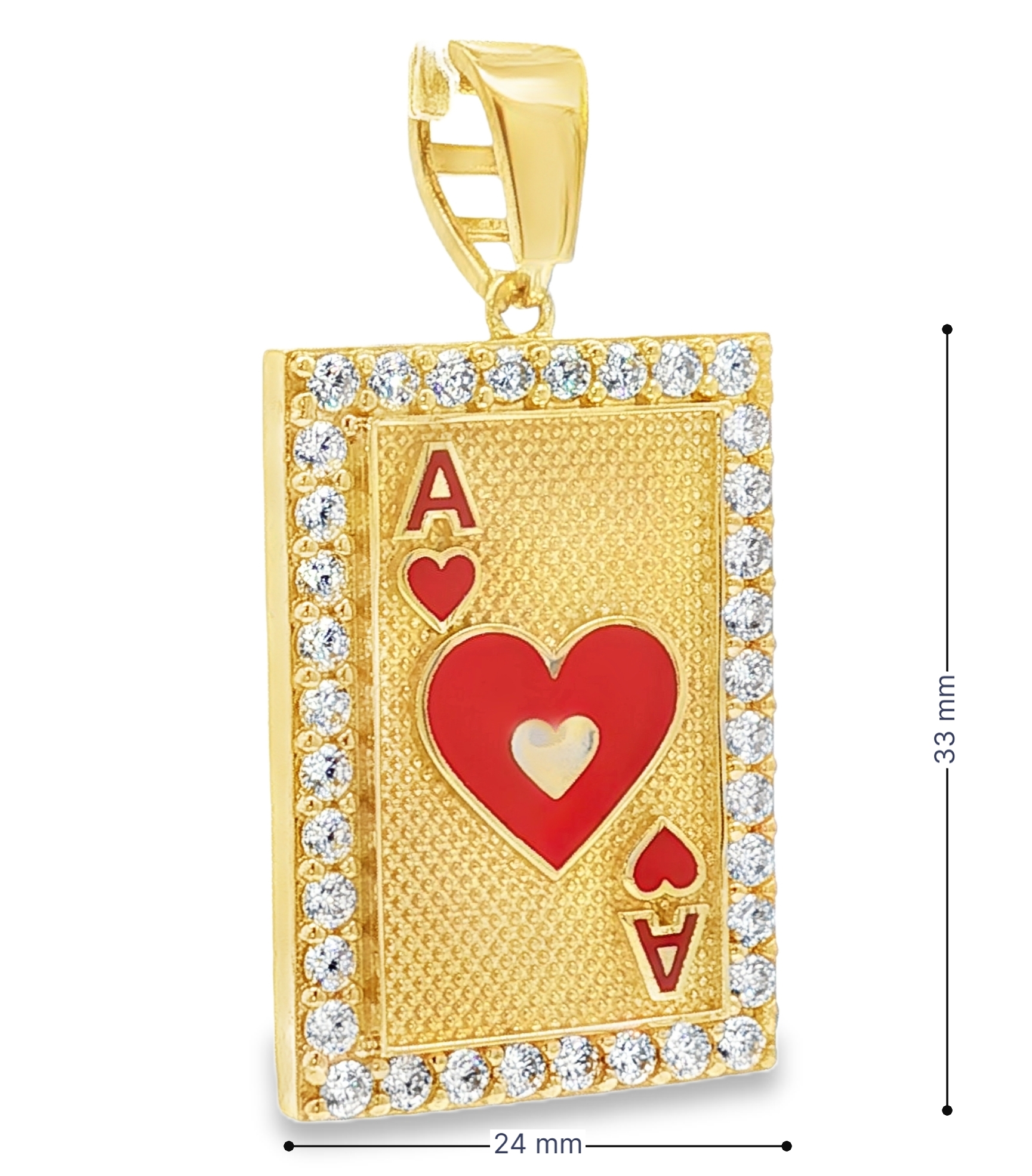 Rehaussez votre style avec ce pendentif carte à jouer as de cœur, façonné en or jaune 750/1000 éclatant. Un entourage d'oxyde de zirconium accentue son design unique et audacieux. Un bijou distinctif, symbole de chance et d'élégance, parfait pour les passionnés de jeux et les amateurs de pièces originales. Ce pendentif affiche des dimensions de 24 mm de largeur pour une hauteur de 33 mm, pour un poids d'or moyen de 11,3 grammes.