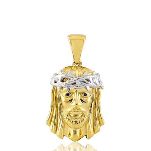 Ce pendentif tout en relief en or 750/1000 à forte symbolique représente le visage du Christ. Avec une finition polie et brillante contrastant sur la couronne d'épines en or blanc, les volumes soulignés, ressortent avec force. Cette médaille affiche des dimensions de 23 mm de largeur pour une hauteur de 30 mm, pour un poids d'or moyen de 10,9 grammes.