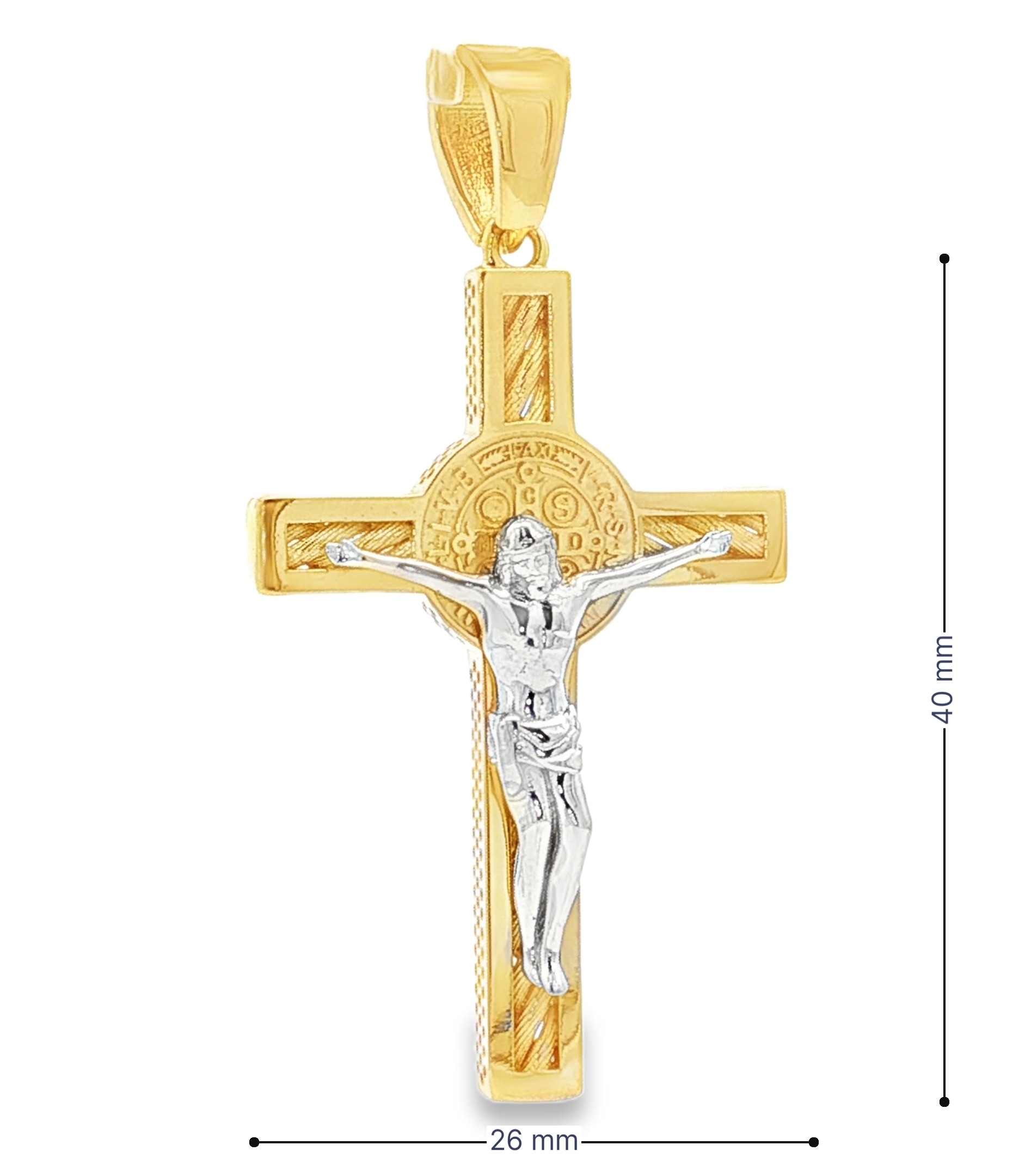 Ce pendentif crucifix en or jaune 18 carats est une expression de foi raffinée. La représentation du Christ en or blanc contraste magnifiquement avec la chaleur de l'or. Les détails ciselés et la bélière dorée témoignent d'un travail artisanal soigné, idéal pour un port quotidien ou comme cadeau symbolique. Cette médaille affiche des dimensions de 26 mm de largeur pour une hauteur de 40 mm, pour un poids d'or moyen de 5,8 grammes.