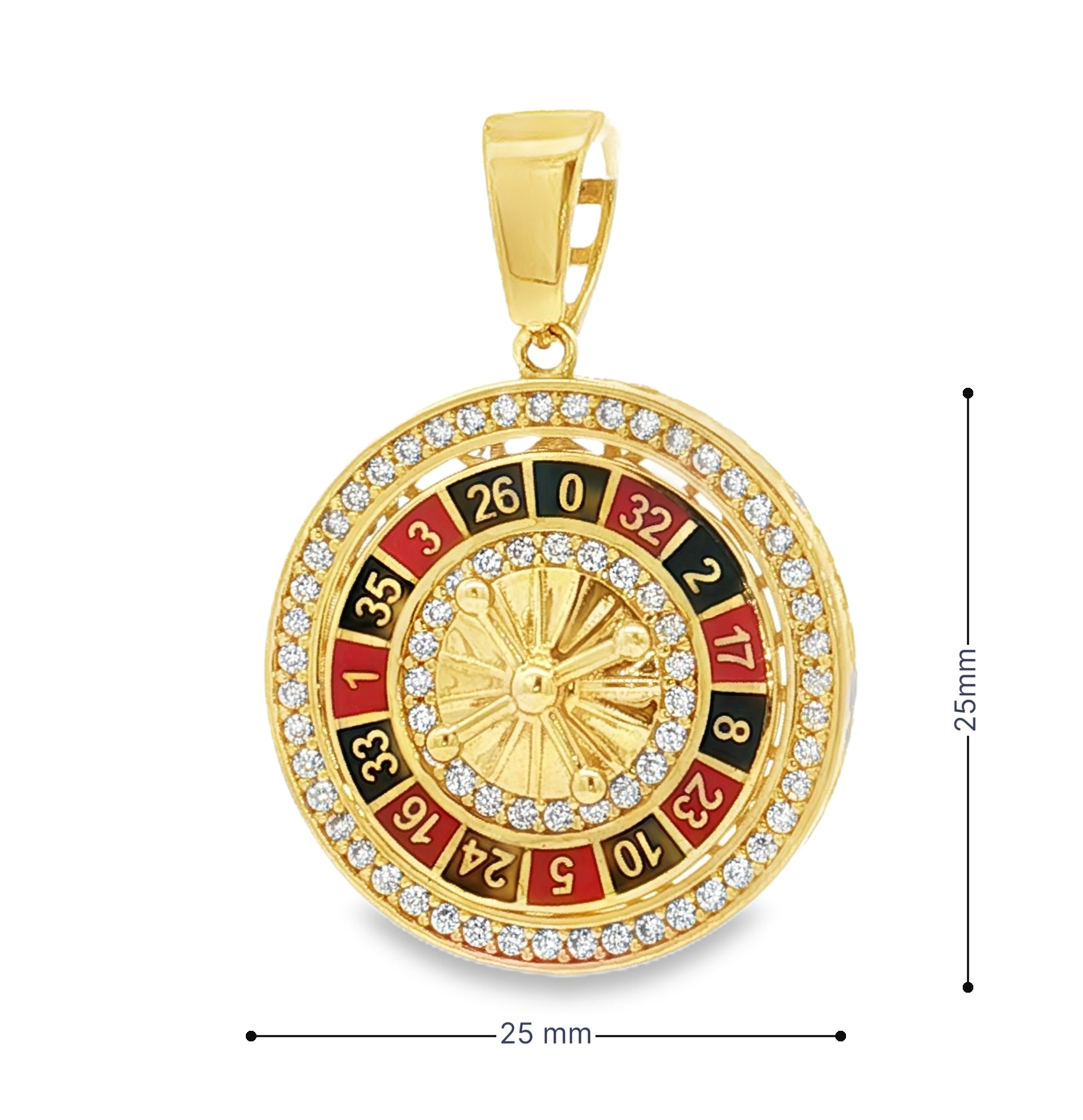 Arborez ce magnifique pendentif en or jaune 18 carats, orné de oxyde de zirconium qui captent la lumière avec éclat. Le design original, évoquant une roue de casino, apporte une touche ludique et élégante. Un bijou d'exception pour affirmer votre style unique. Ce pendentif afficheun diamètre de 25 mm, pour un poids d'or moyen de 9,2 grammes.