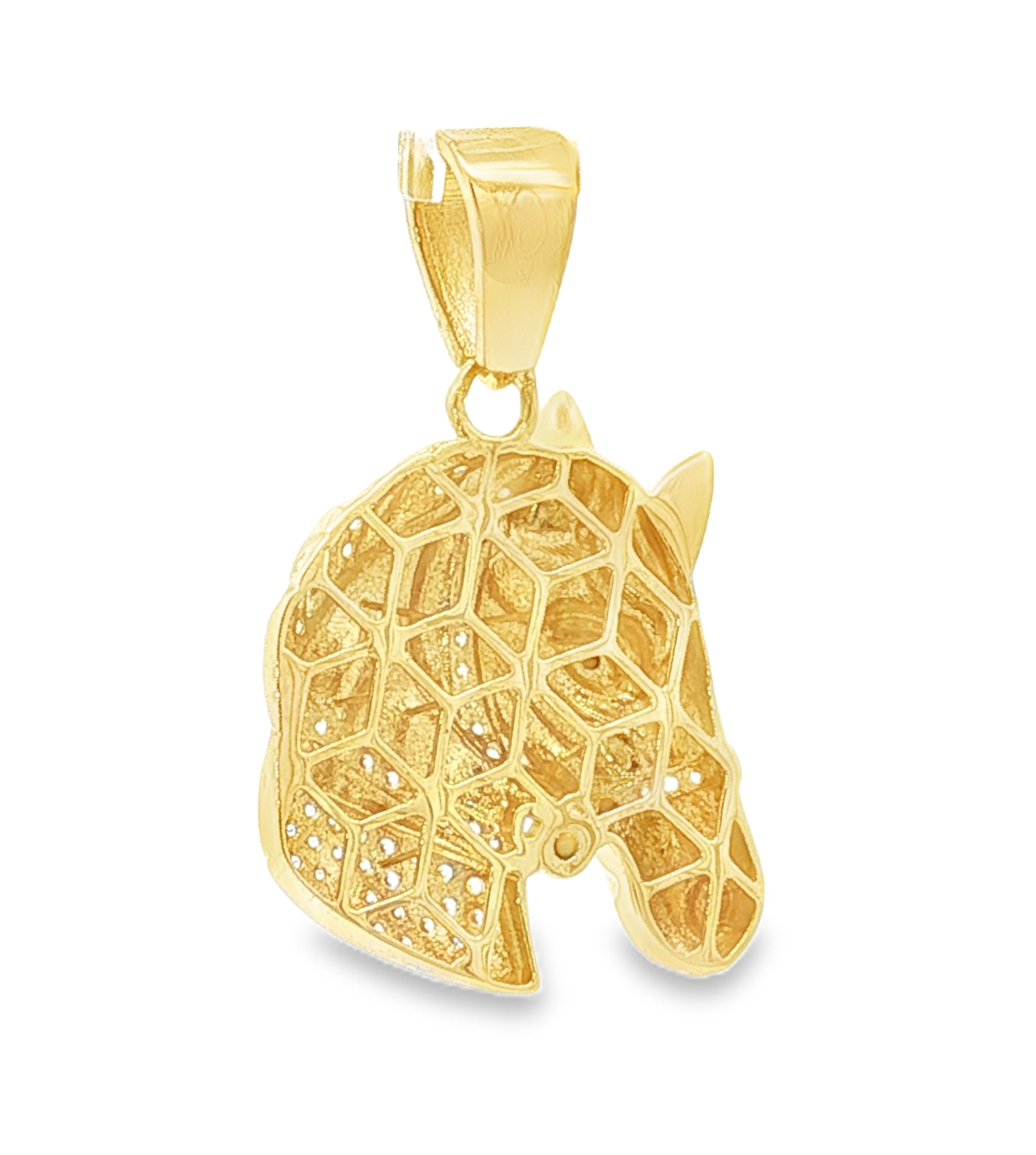 Ce pendentif équestre en or jaune 18 carats est une pièce de joaillerie distinctive. L'or jaune met en valeur le design épuré et les détails complexes de la tête de cheval. Les oxydes de zirconium ajoutent une touche d'éclat et de luxe, faisant de ce pendentif un symbole de prestige et de raffinement. Il incarne un style équestre sophistiqué, parfait pour les passionnés de chevaux et d'élégance. Ce pendentif affiche des dimensions de 22 mm de largeur pour une hauteur de 24 mm, pour un poids d'or moyen de 4,8 grammes.